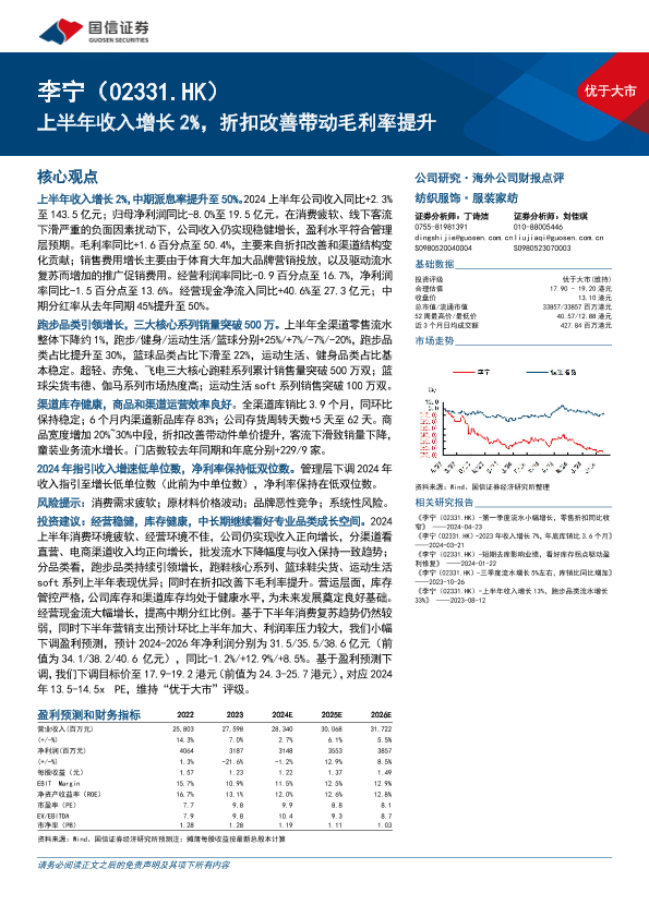 【国信证券】【20240817】李宁(02331.HK)上半年收入增长225,折扣改善带动毛利率提升-13页