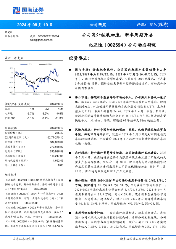 【国海证券】【20240819】比亚迪(002594)公司动态研究:公司海外拓展加速,新车周期开启-18页