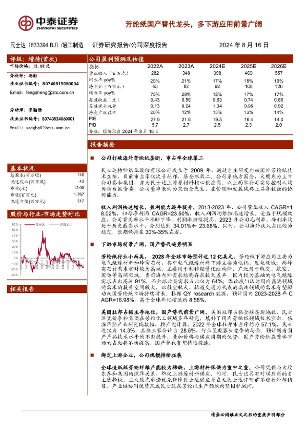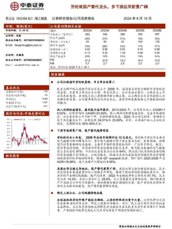 【中泰证券】【20240816】民士达(833394)芳纶纸国产替代龙头,多下游应用前景广阔-22页