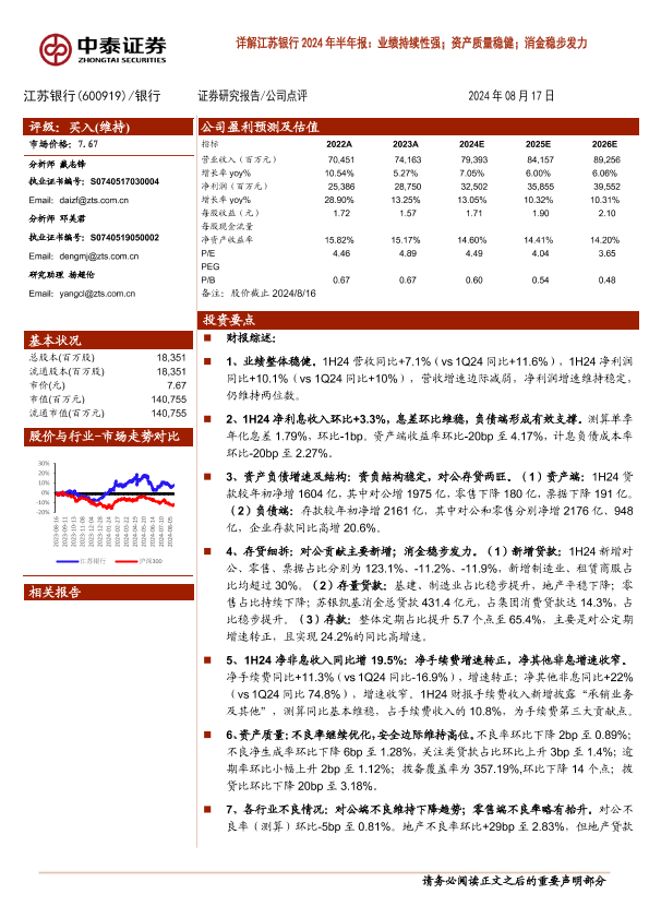 【中泰证券】【20240817】江苏银行(600919)详解江苏银行2024年半年报:业绩持续性强;资产质量稳健;消金稳步发力-20页