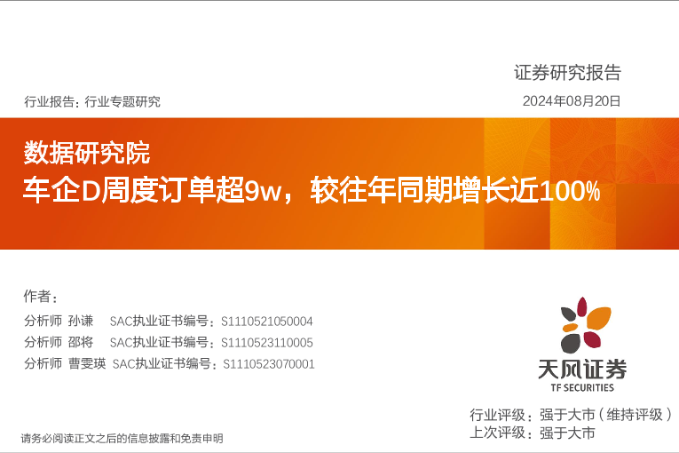 【天风证券】【20240820】车企D周度订单超9w,较往年同期增长近100%-11页