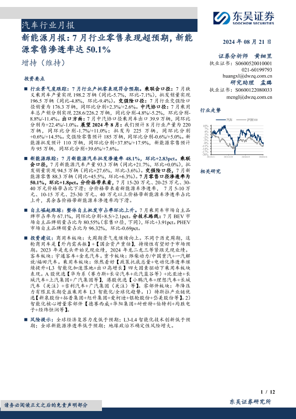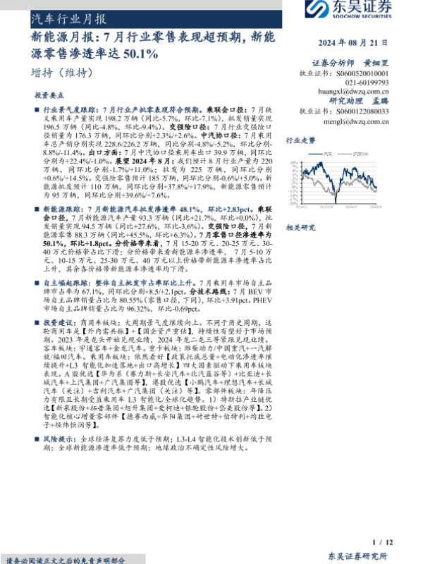 【东吴证券】【20240821】汽车行业月报:新能源月报,7月行业零售表现超预期,新能源零售渗透率达50.1%-12页