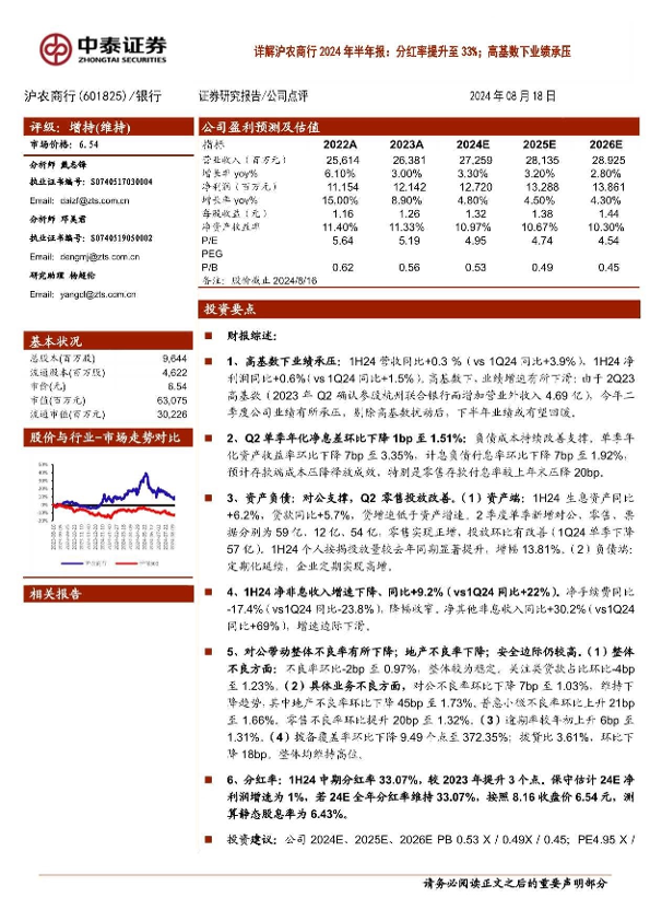 【中泰证券】【20240818】沪农商行(601825)详解沪农商行2024年半年报:分红率提升至33%25;高基数下业绩承压-14页