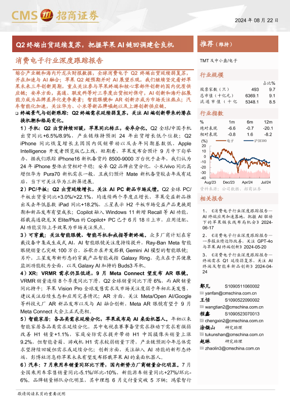 【海通证券】【20240822】消费电子行业深度跟踪报告:Q2终端出货延续复苏,把握苹果AI链回调建仓良机-80页