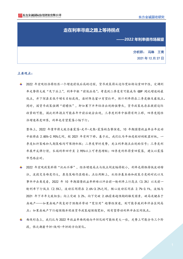 【东方金诚】【20211227】2022年利率债市场展望:走在利率寻底之路上等待拐点-28页