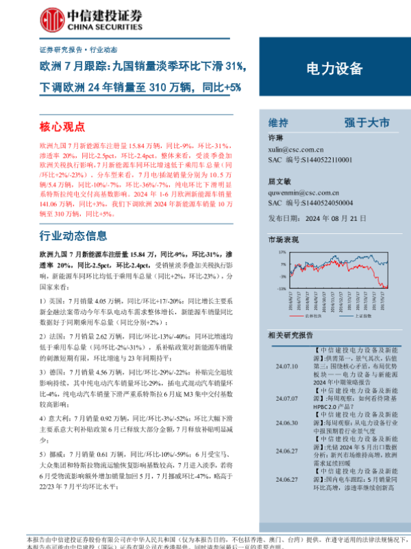 【中信建投证券】【20240821】电力设备行业欧洲7月跟踪:九国销量淡季环比下滑31%,下调欧洲24年销量至310万辆,同比+5%-23页