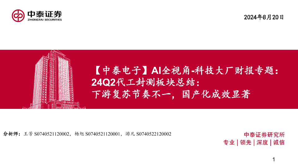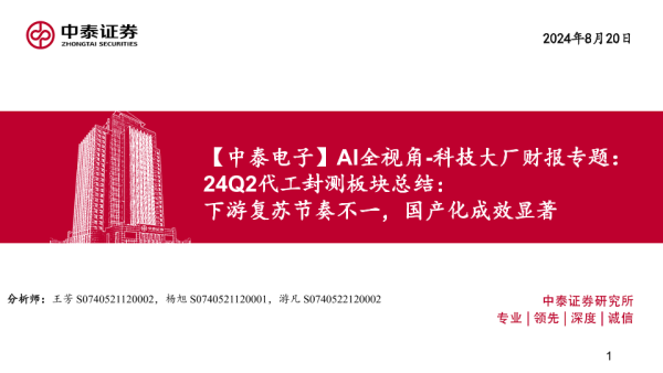 【中泰证券】【20240820】电子行业AI全视角-科技大厂财报专题-24Q2代工封测板块总结:下游复苏节奏不一,国产化成效显著-45页