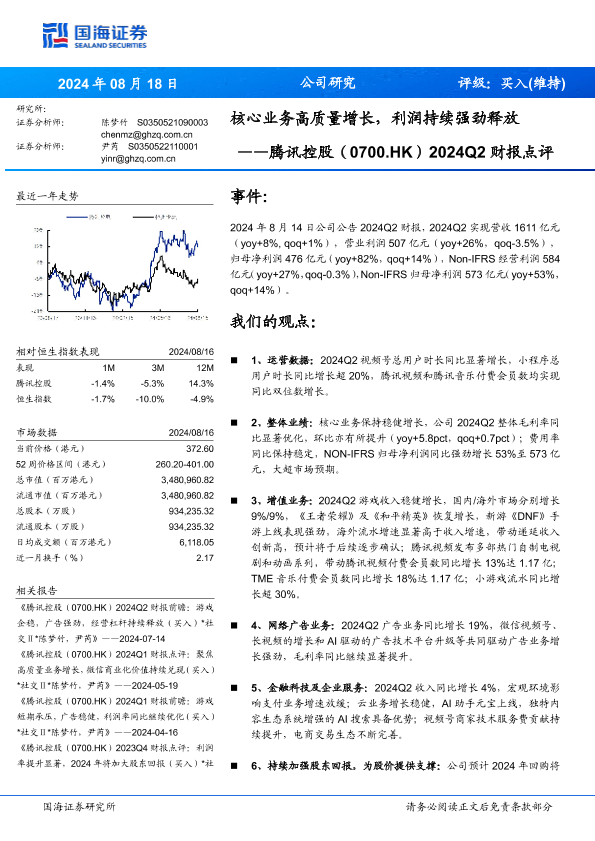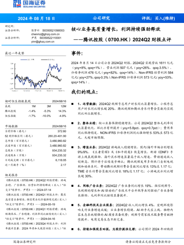 【国海证券】【20240818】腾讯控股(0700.HK)2024Q2财报点评:核心业务高质量增长,利润持续强劲释放-15页
