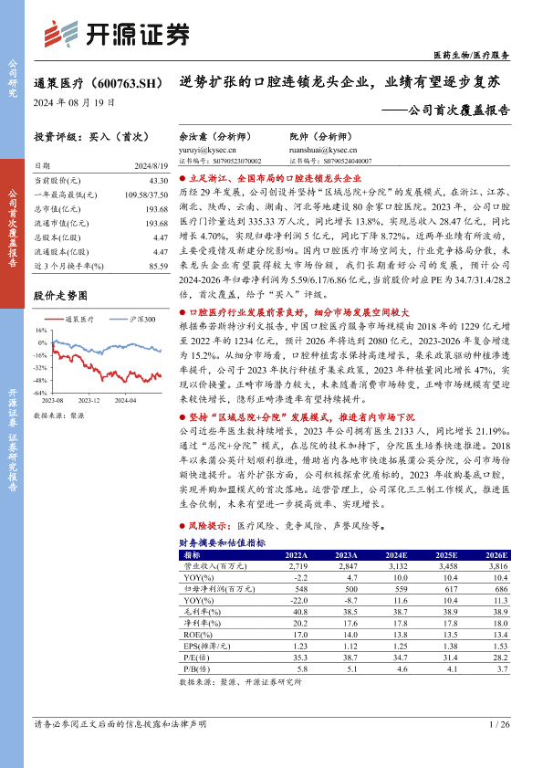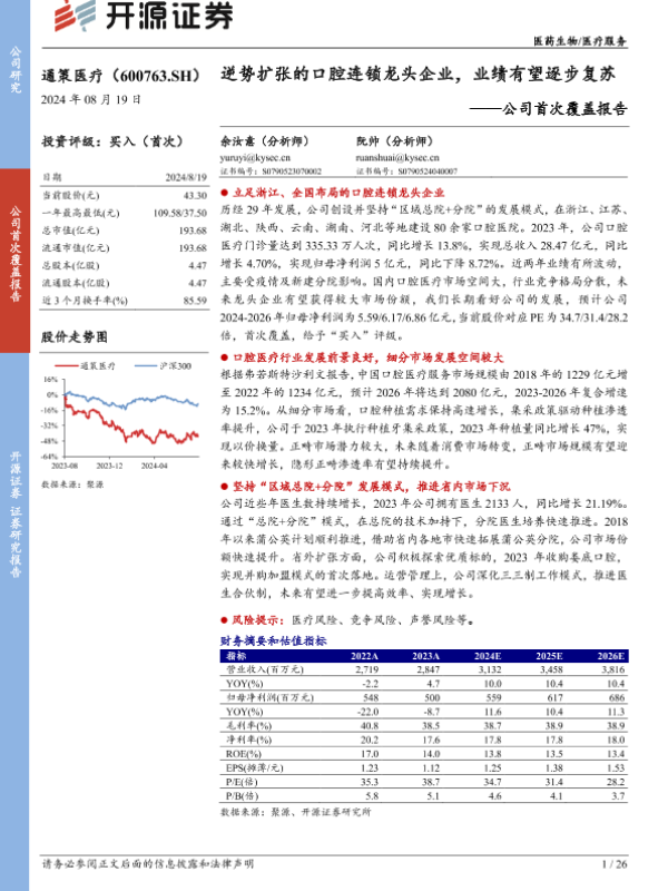 【开源证券】【20240819】通策医疗(600763)公司首次覆盖报告:逆势扩张的口腔连锁龙头企业,业绩有望逐步复苏-26页