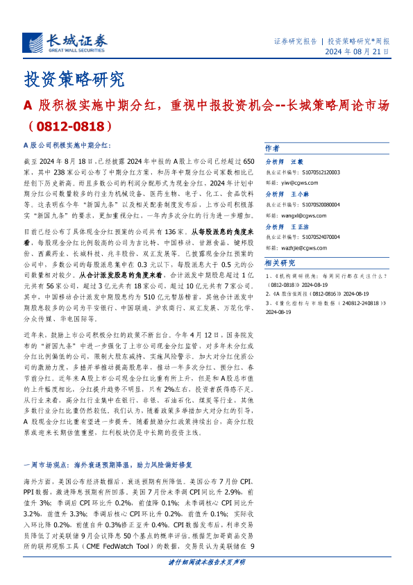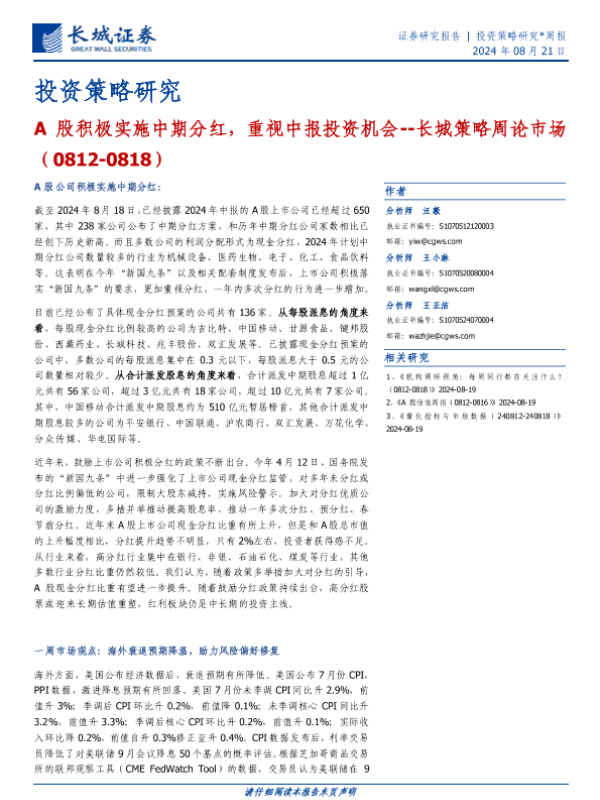 【长城证券】【20240821】A股积极实施中期分红,重视中报投资机会--长城策略周论市场 (0812-0818)-10页