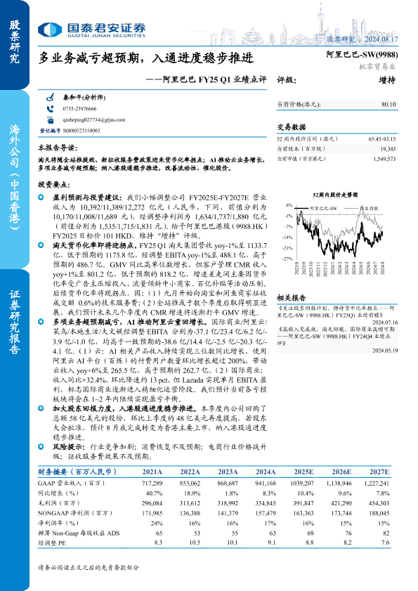 【国泰君安证券】【20240817】阿里巴巴-SW(9988.HK)FY25Q1业绩点评:多业务减亏超预期,入通进度稳步推进-11页