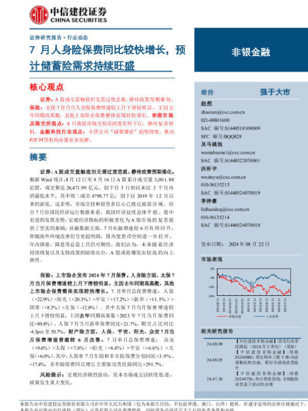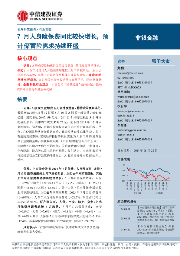 【中信建投证券】【20240822】非银金融行业:7月人身险保费同比较快增长,预计储蓄险需求持续旺盛-24页