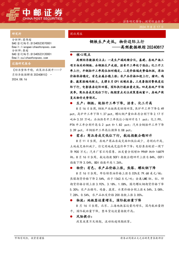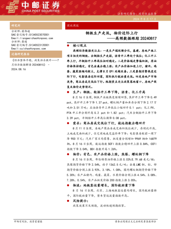 【中邮证券】【20240817】高频数据跟踪:钢铁生产走低,物价边际上行-13页