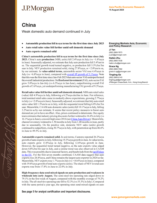 【J.P. Morgan】【20240815】中国7月国内汽车需求持续疲软-9页