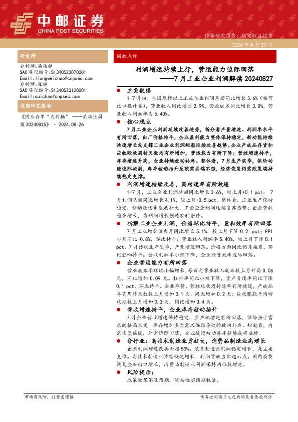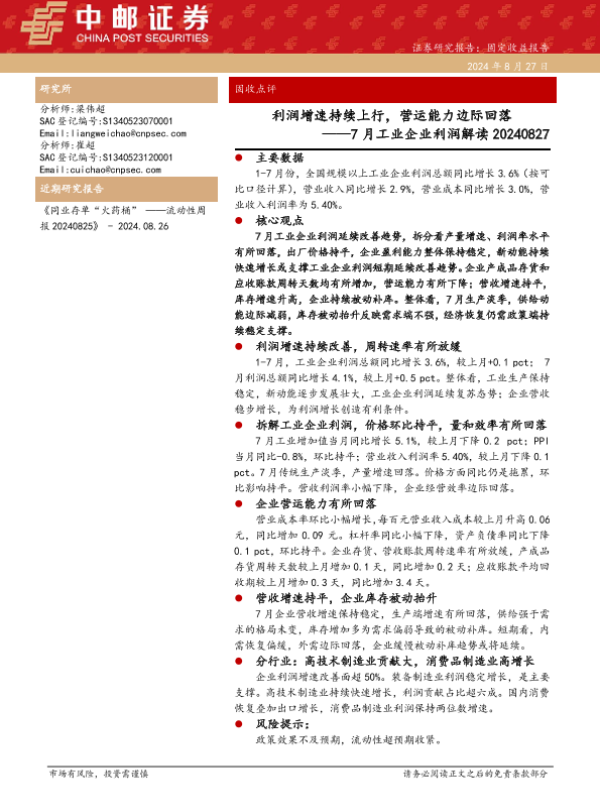 【中邮证券】【20240827】7月工业企业利润解读:利润增速持续上行,营运能力边际回落-10页