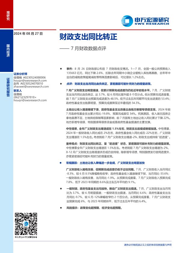 【申万宏源】【20240827】7月财政数据点评:财政支出同比转正-10页