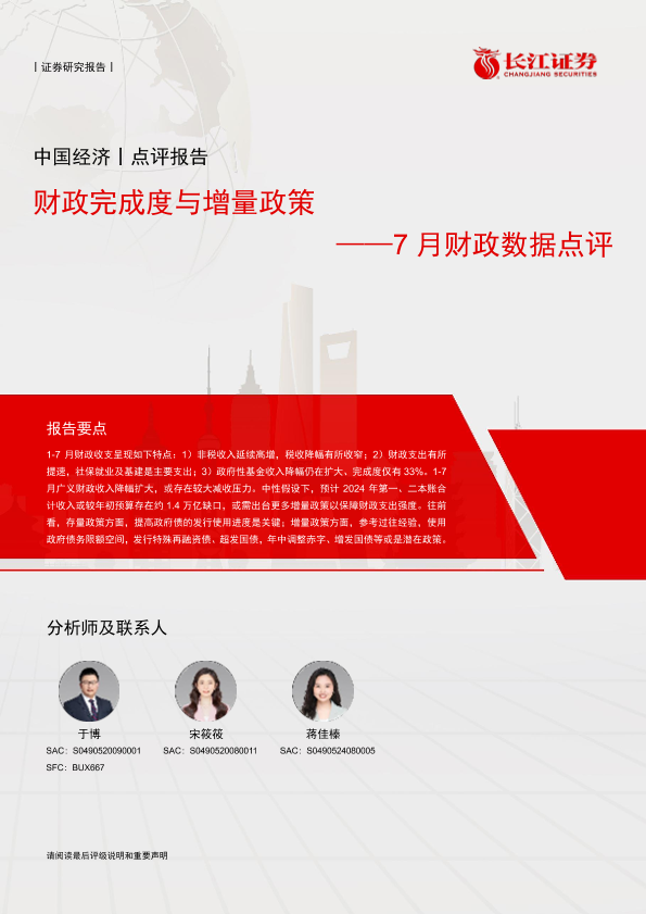 【长江证券】【20240827】7月财政数据点评:财政完成度与增量政策-10页