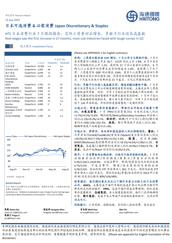 【海通国际】【20240823】HTI日本消费行业7月跟踪报告:实际工资重回正增长,多数子行业迎来高基数-25页