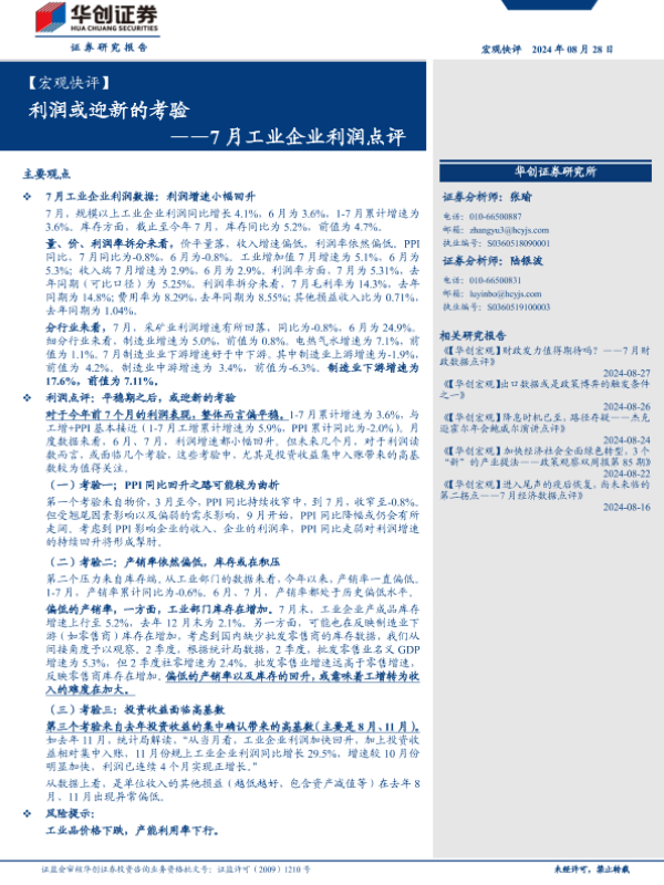 【华创证券】【20240828】【宏观快评】7月工业企业利润点评:利润或迎新的考验-10页