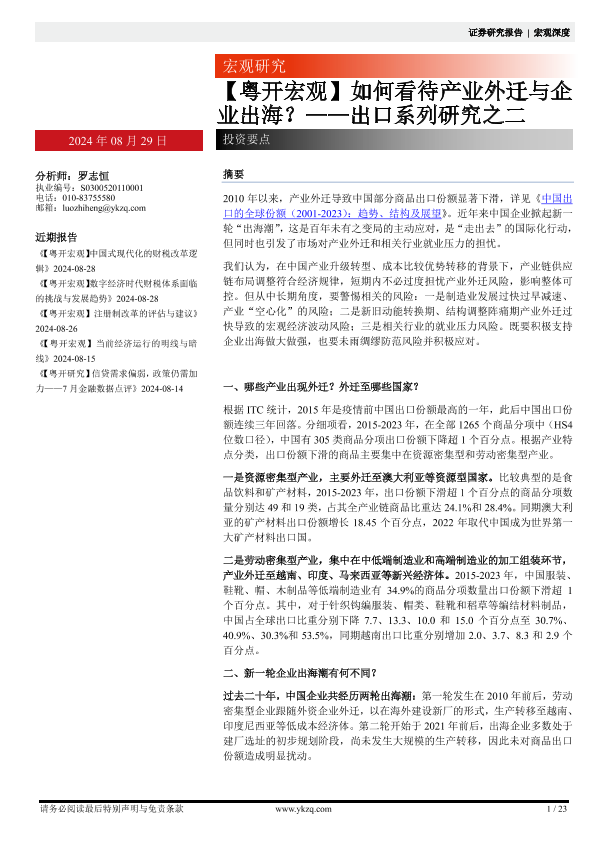 【粤开证券】【20240829】【粤开宏观】出口系列研究之二:如何看待产业外迁与企业出海?-23页