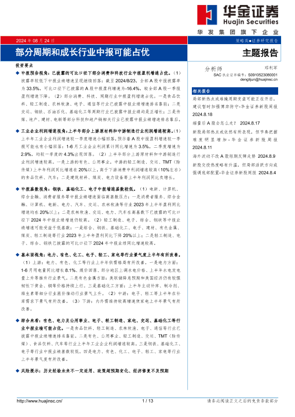 【华金证券】【20240824】部分周期和成长行业中报可能占优-13页