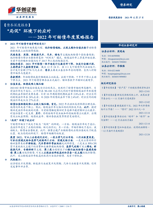 【华创证券】【20211227】2022年可转债年度策略报告:“局促”环境下的应对-27页