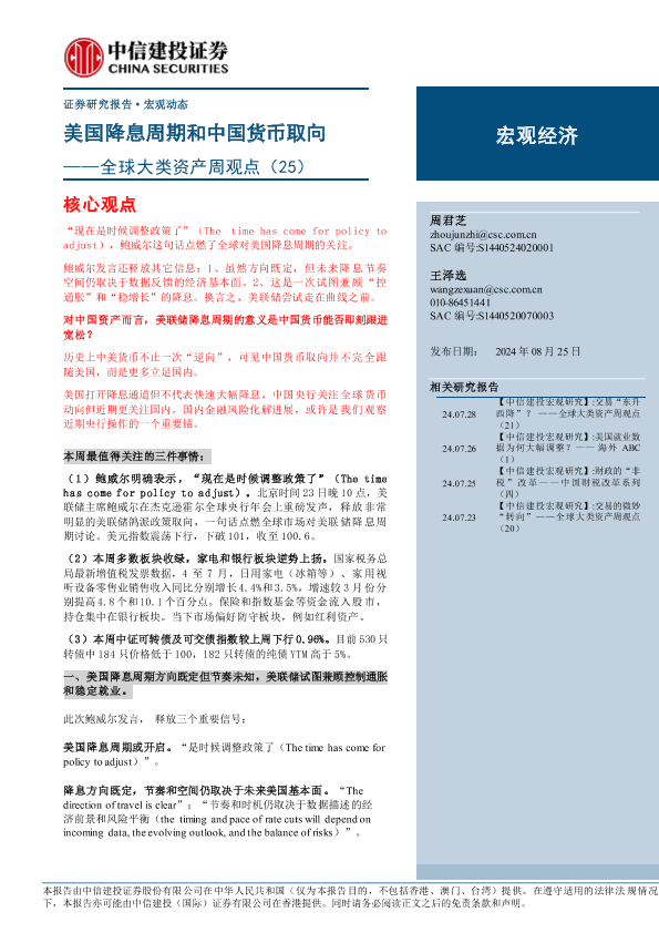 【中信建投证券】【20240825】全球大类资产周观点(25):美国降息周期和中国货币取向-16页