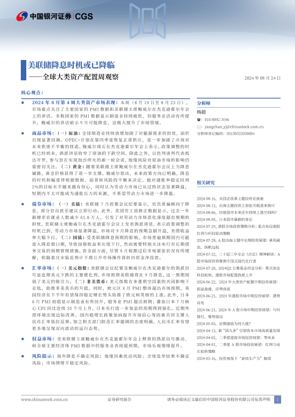 【银河证券】【20240824】全球大类资产配置周观察:美联储降息时机或已降临-12页