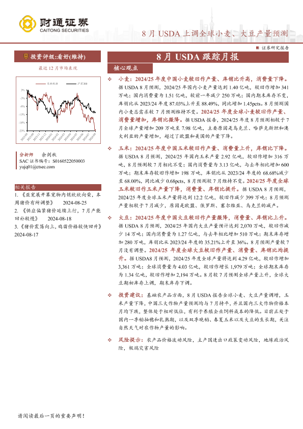 【财通证券】【20240826】农林牧渔行业8月USDA跟踪月报:8月USDA上调全球小麦、大豆产量预测-14页