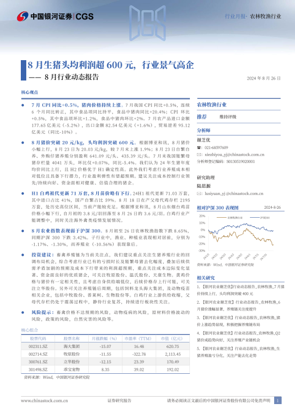 【银河证券】【20240826】农林牧渔行业8月行业动态报告:8月生猪头均利润超600元,行业景气高企-23页