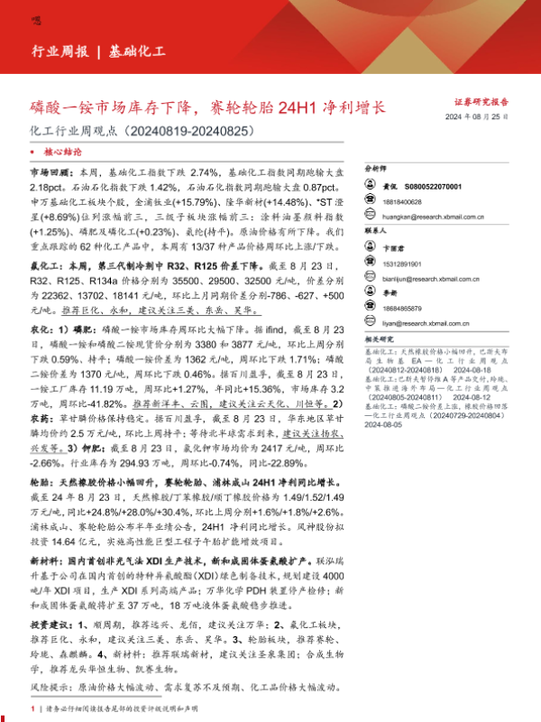 【西部证券】【20240825】化工行业周观点:磷酸一铵市场库存下降,赛轮轮胎24H1净利增长-18页