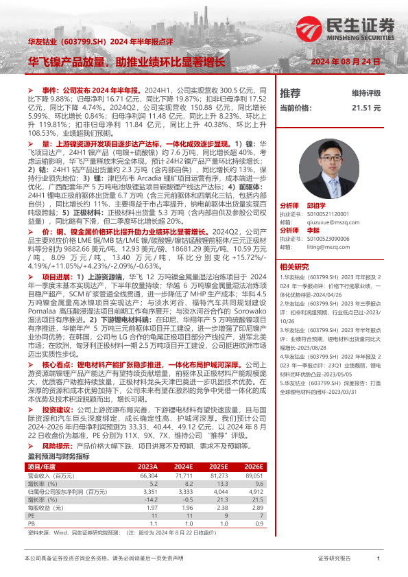 【民生证券】【20240824】华友钴业(603799)2024年半年报点评:华飞镍产品放量,助推业绩环比显著增长-22页