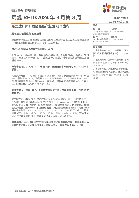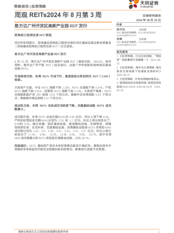 【天风证券】【20240825】周观REITs2024年8月第3周:易方达广州开发区高新产业园REIT发行-18页