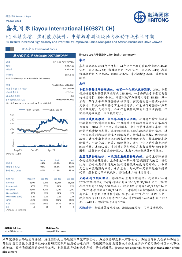【海通国际】【20240829】嘉友国际(603871)H1业绩高增,盈利能力提升,中蒙与非洲板块强力驱动下成长性可期-13页
