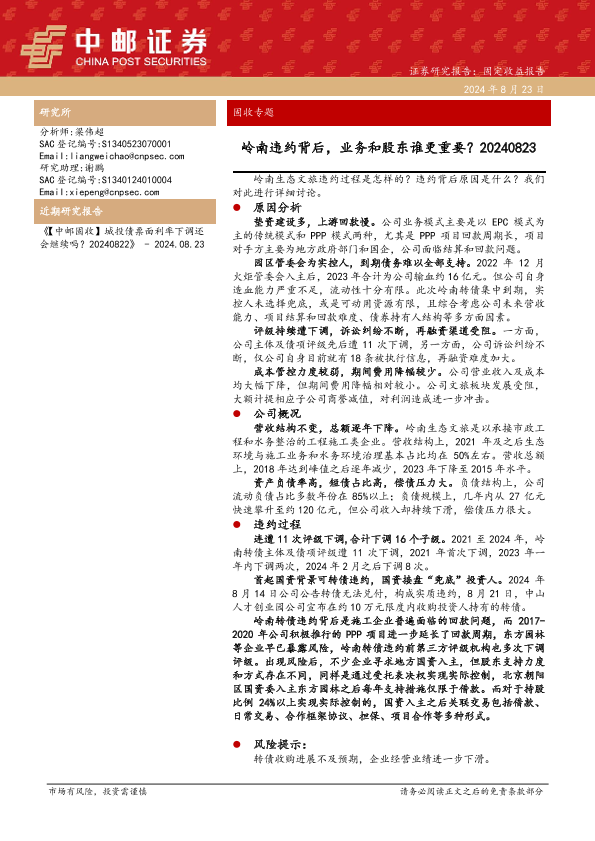 【中邮证券】【20240823】固收专题:岭南违约背后,业务和股东谁更重要?-17页
