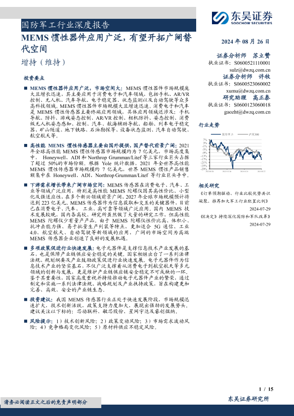 【东吴证券】【20240826】国防军工行业深度报告:MEMS惯性器件应用广泛,有望开拓广阔替代空间-15页