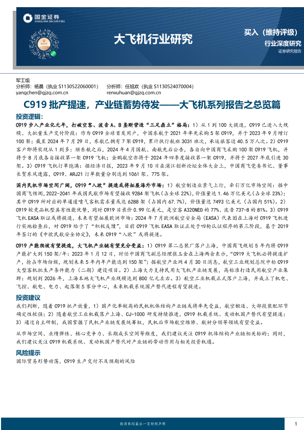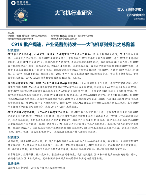 【国金证券】【20240828】大飞机行业研究:大飞机系列报告之总览篇,C919批产提速,产业链蓄势待发-32页