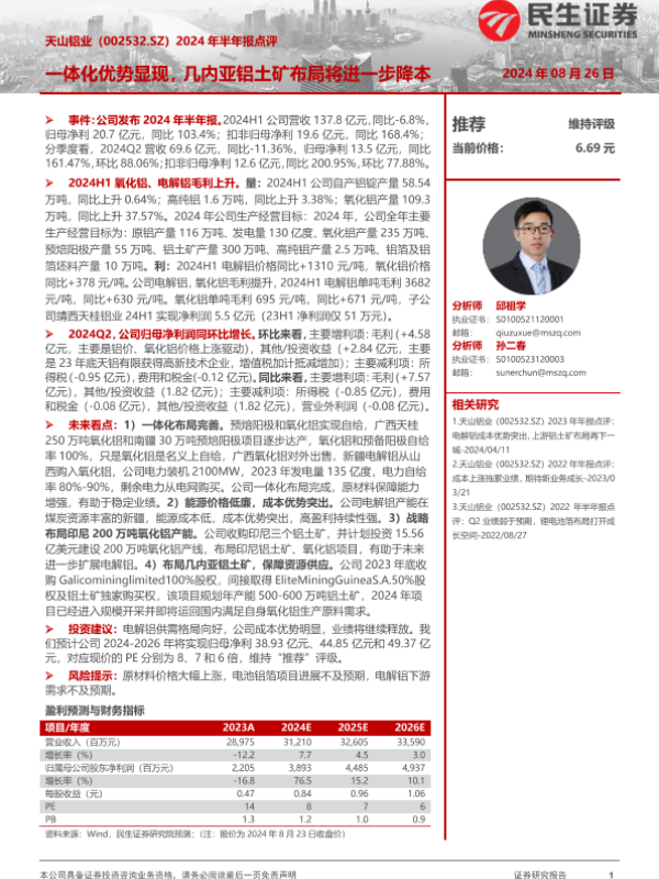 【民生证券】【20240826】天山铝业(002532)2024年半年报点评:一体化优势显现,几内亚铝土矿布局将进一步降本-15页