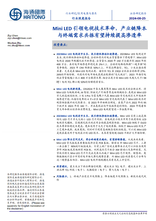 【海通国际】【20240825】家用电器与器具行业深度报告:MiniLED引领电视技术革命,产业链降本与终端需求共振有望持续提高渗透率-32页