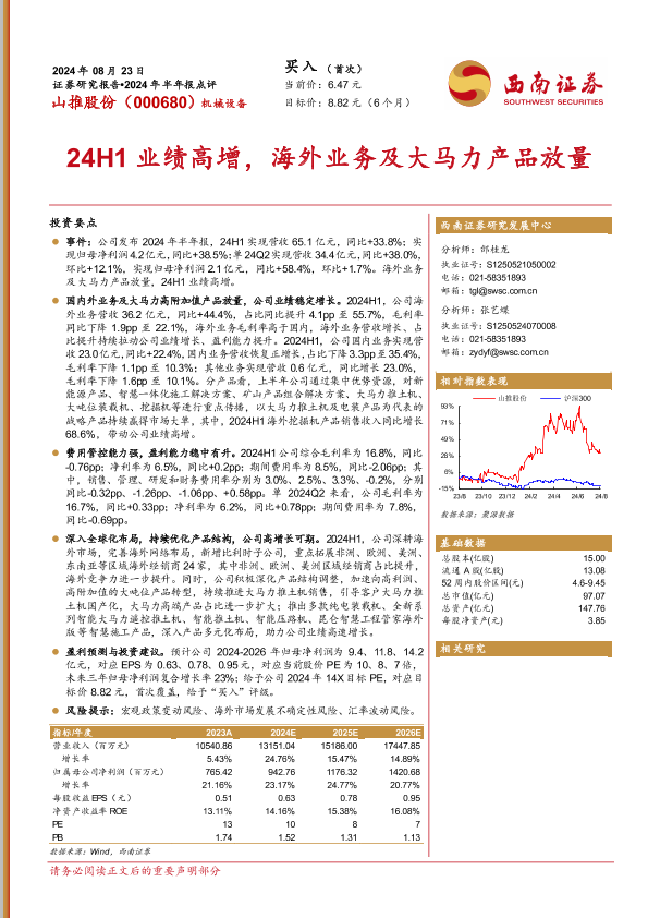 【西南证券】【20240823】山推股份(000680)2024年半年报点评:24H1业绩高增,海外业务及大马力产品放量-13页