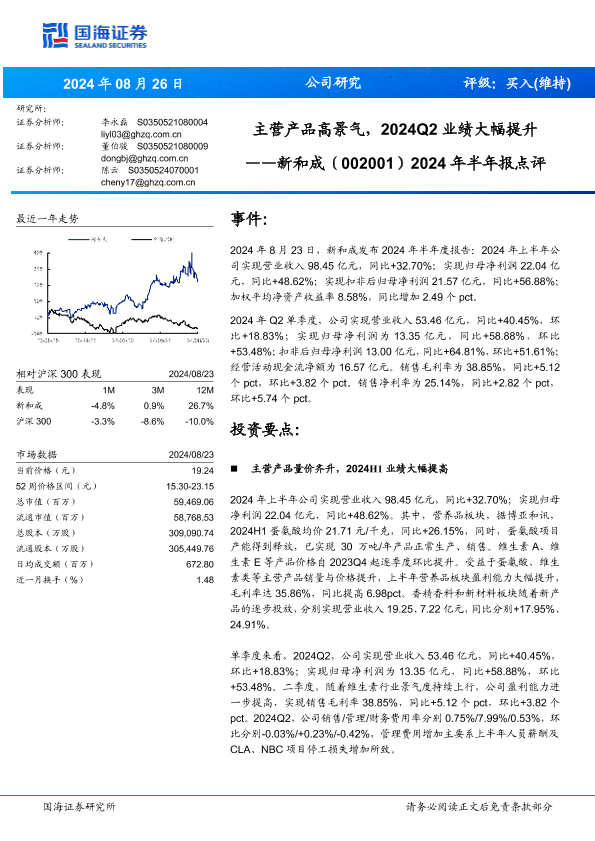 【国海证券】【20240826】新和成(002001)2024年半年报点评:主营产品高景气,2024Q2业绩大幅提升-10页