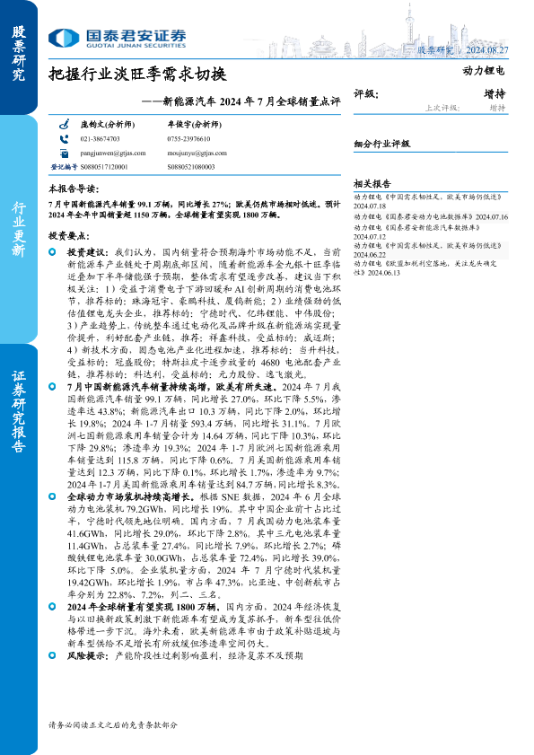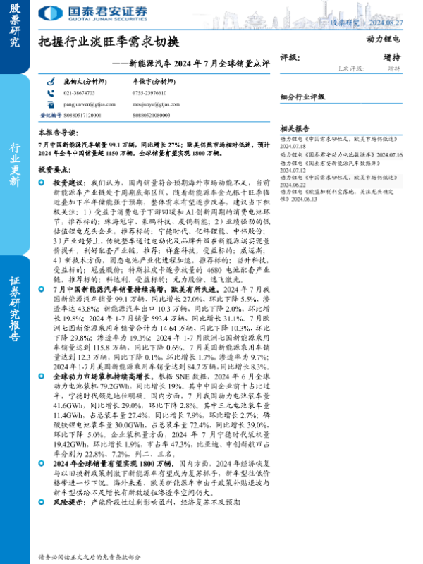 【国泰君安证券】【20240827】新能源汽车行业2024年7月全球销量点评:把握行业淡旺季需求切换-11页