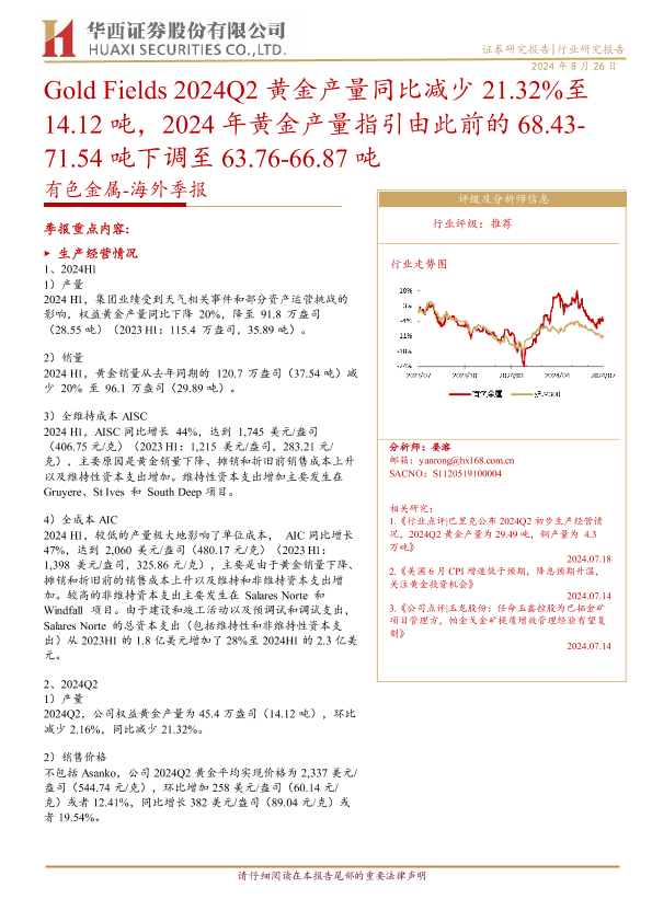 【华西证券】【20240826】有色金属行业-海外季报:Gold Fields 2024Q2黄金产量同比减少21.32%至14.12吨,2024年黄金产量指引下调-8页