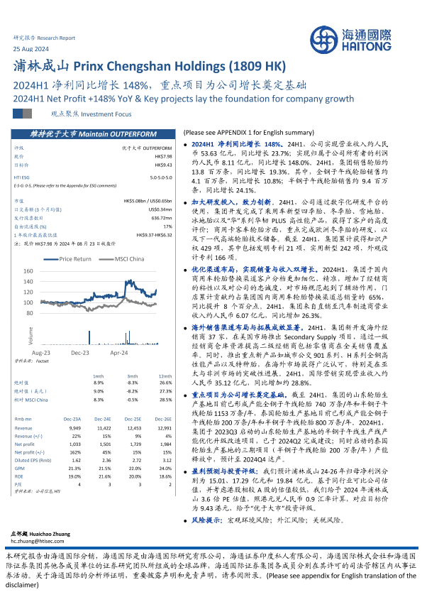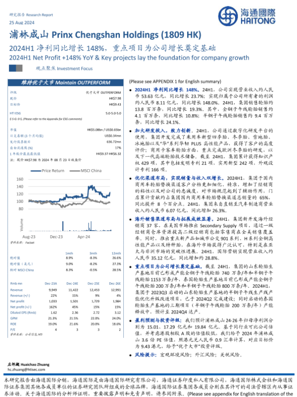 【海通国际】【20240825】浦林成山(1809.HK)2024H1净利同比增长148%,重点项目为公司增长奠定基础-12页