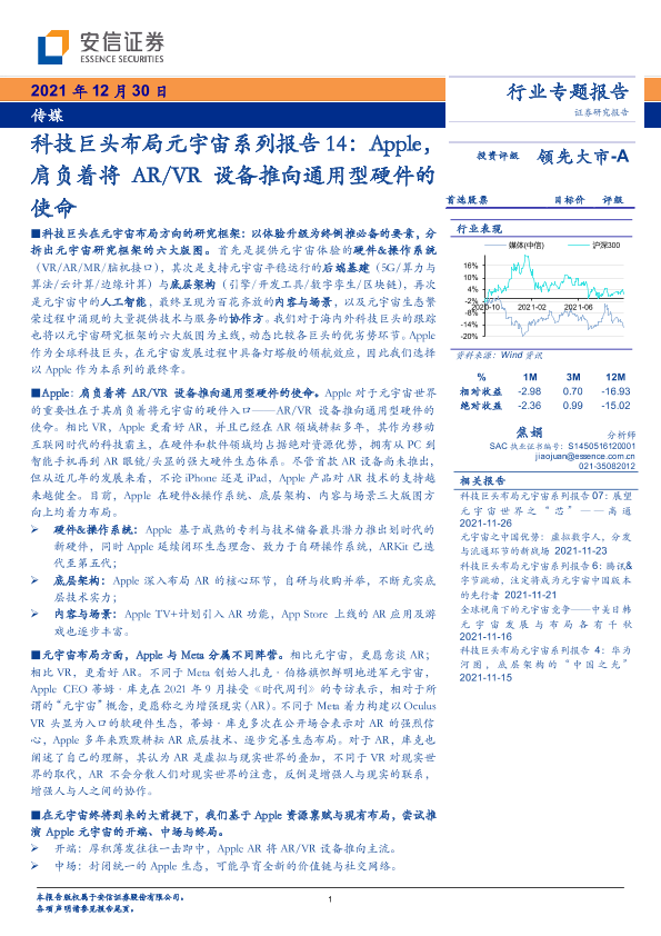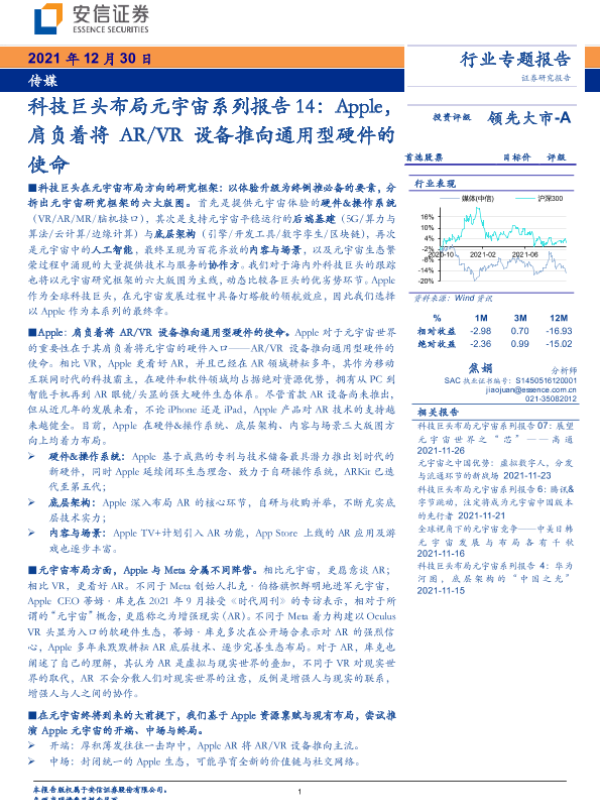 【安信证券】【20211230】传媒行业科技巨头布局元宇宙系列报告14:Apple,肩负着将ARVR设备推向通用型硬件的使命-15页