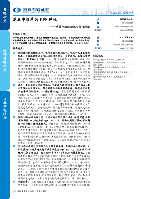 【国泰君安证券】【20240825】港股市场流动性与估值跟踪:港股中报季的EPS弹性-11页