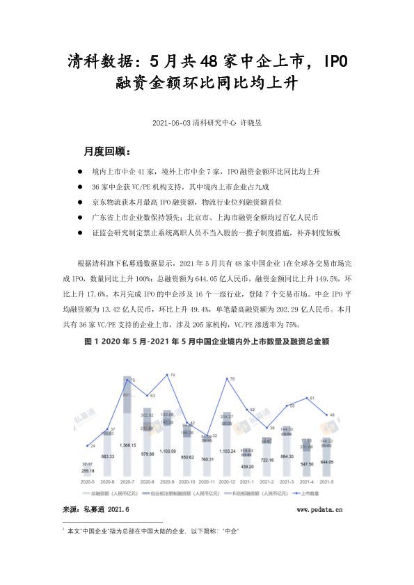 【清科研究中心】【20210603】清科数据-5月共48家中企上市,IPO融资金额环比同比均上升-2021.6-12页