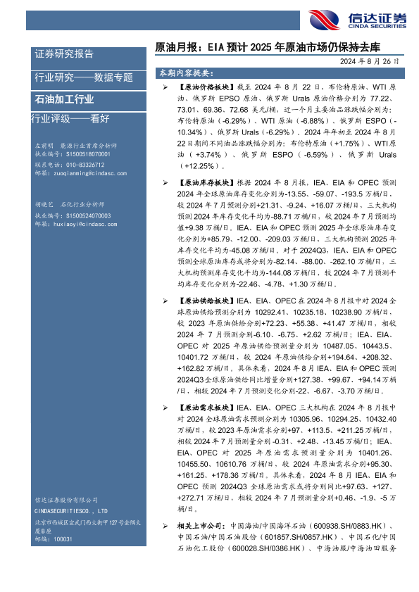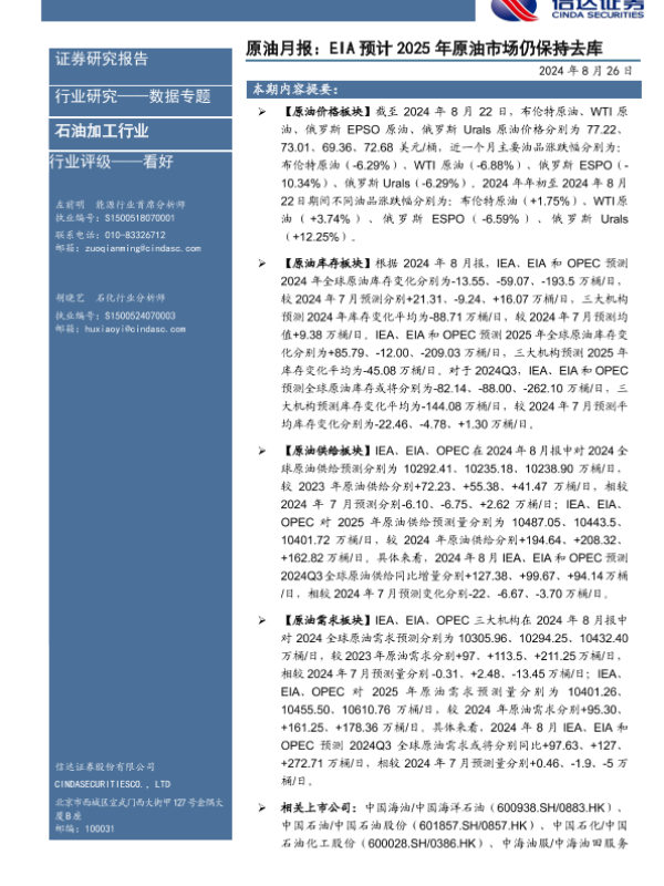 【信达证券】【20240826】石油加工行业原油月报:EIA预计2025年原油市场仍保持去库-27页