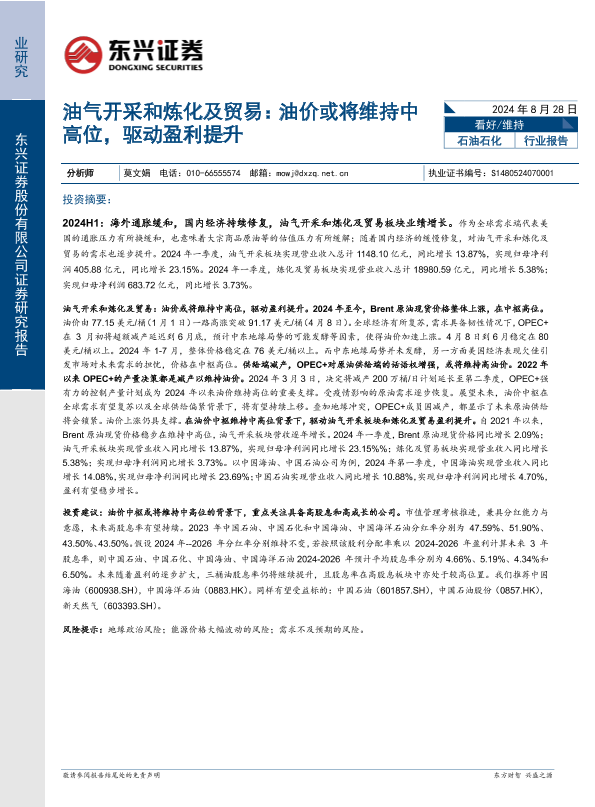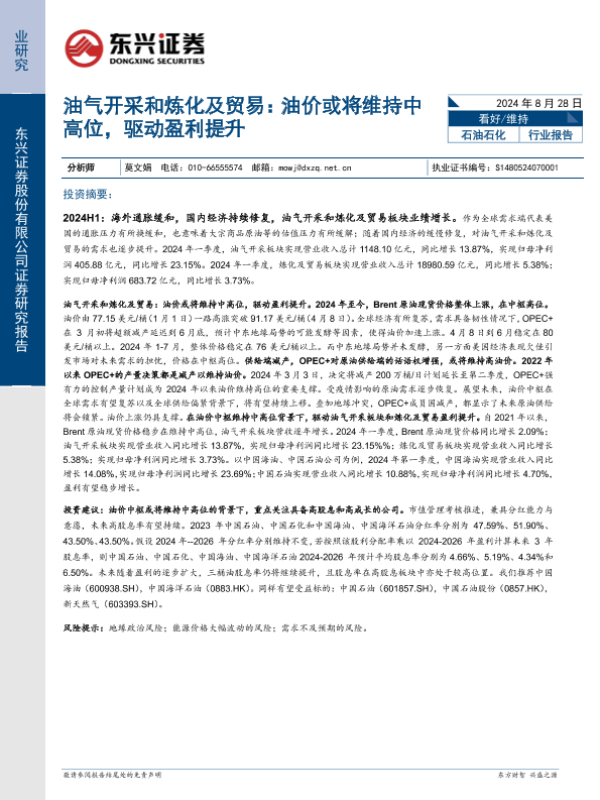 【东兴证券】【20240828】油气开采和炼化及贸易:油价或将维持中高位,驱动盈利提升-12页