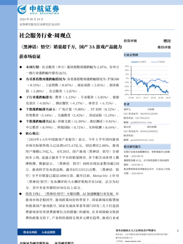 【中航证券】【20240824】社会服务行业·周观点:《黑神话:悟空》销量超千万,国产3A游戏产品能力获市场验证-11页